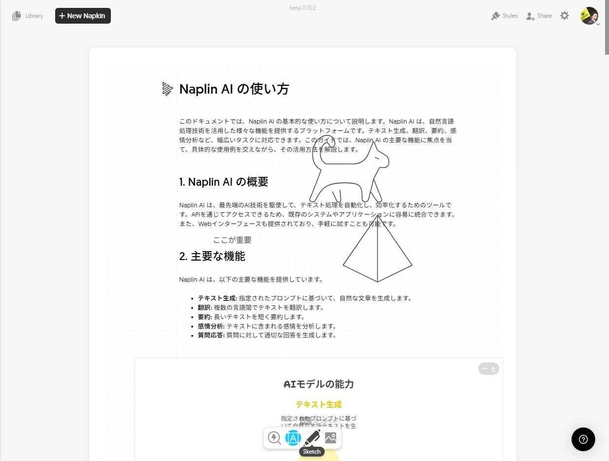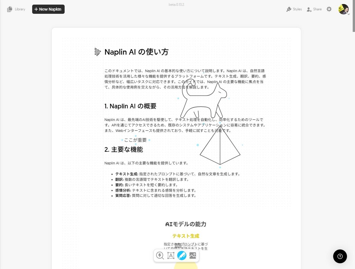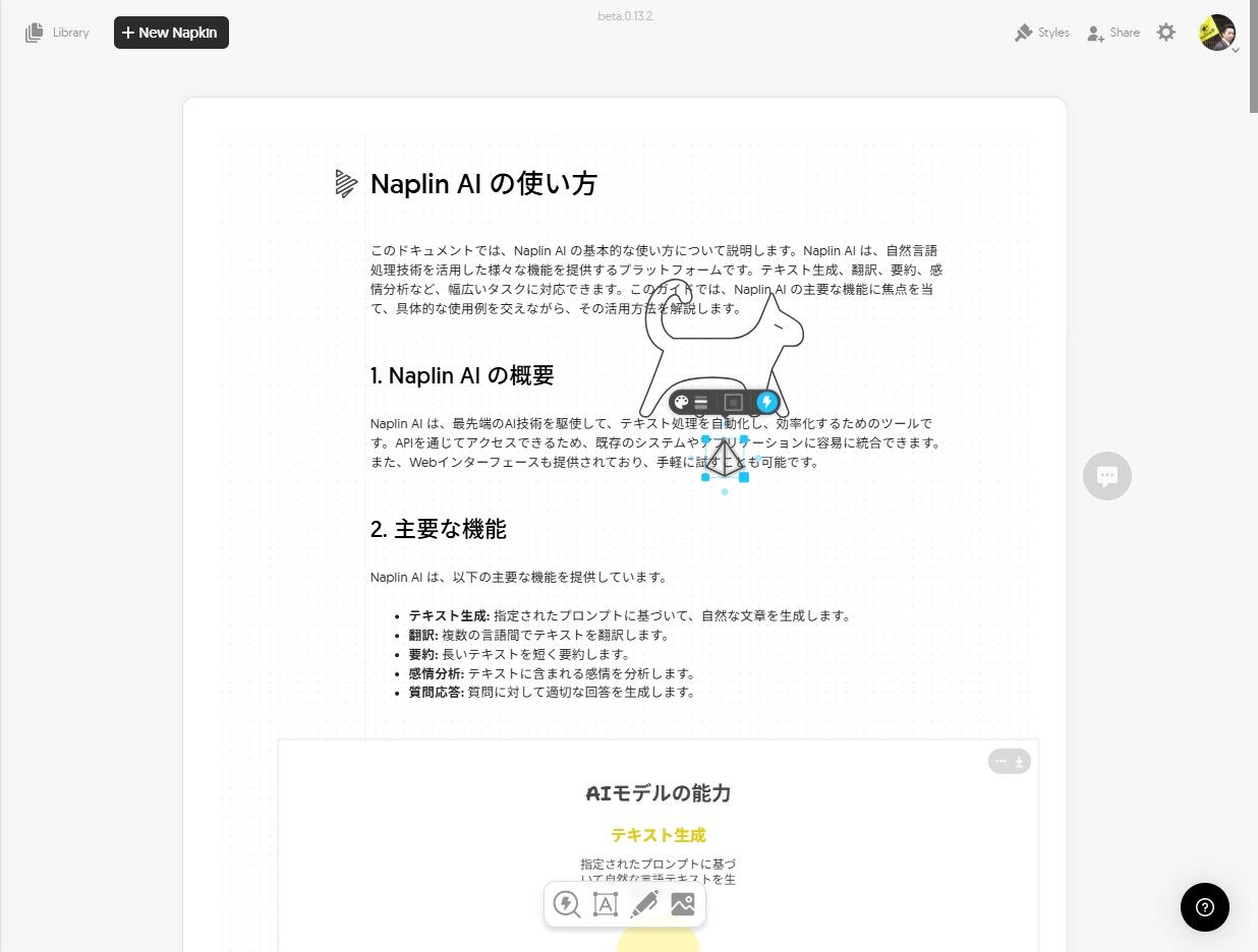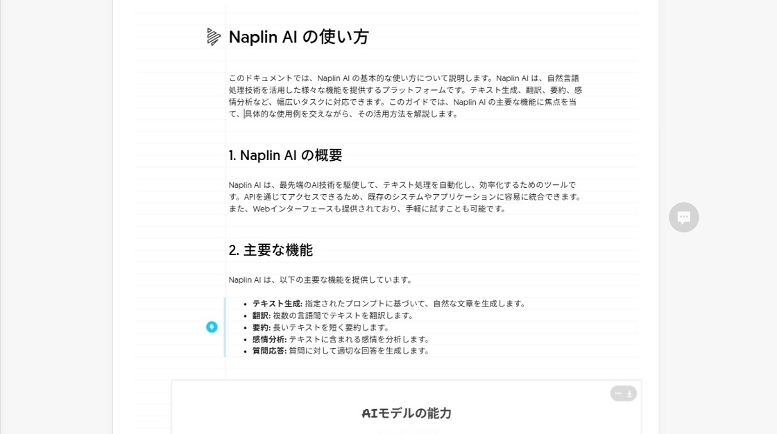 Naplin AI は、自然言語処理技術を活用した様々な機能を提供する生成AIです。テキスト生成、翻訳、要約、感情分析など、幅広いタスクに対応できます。