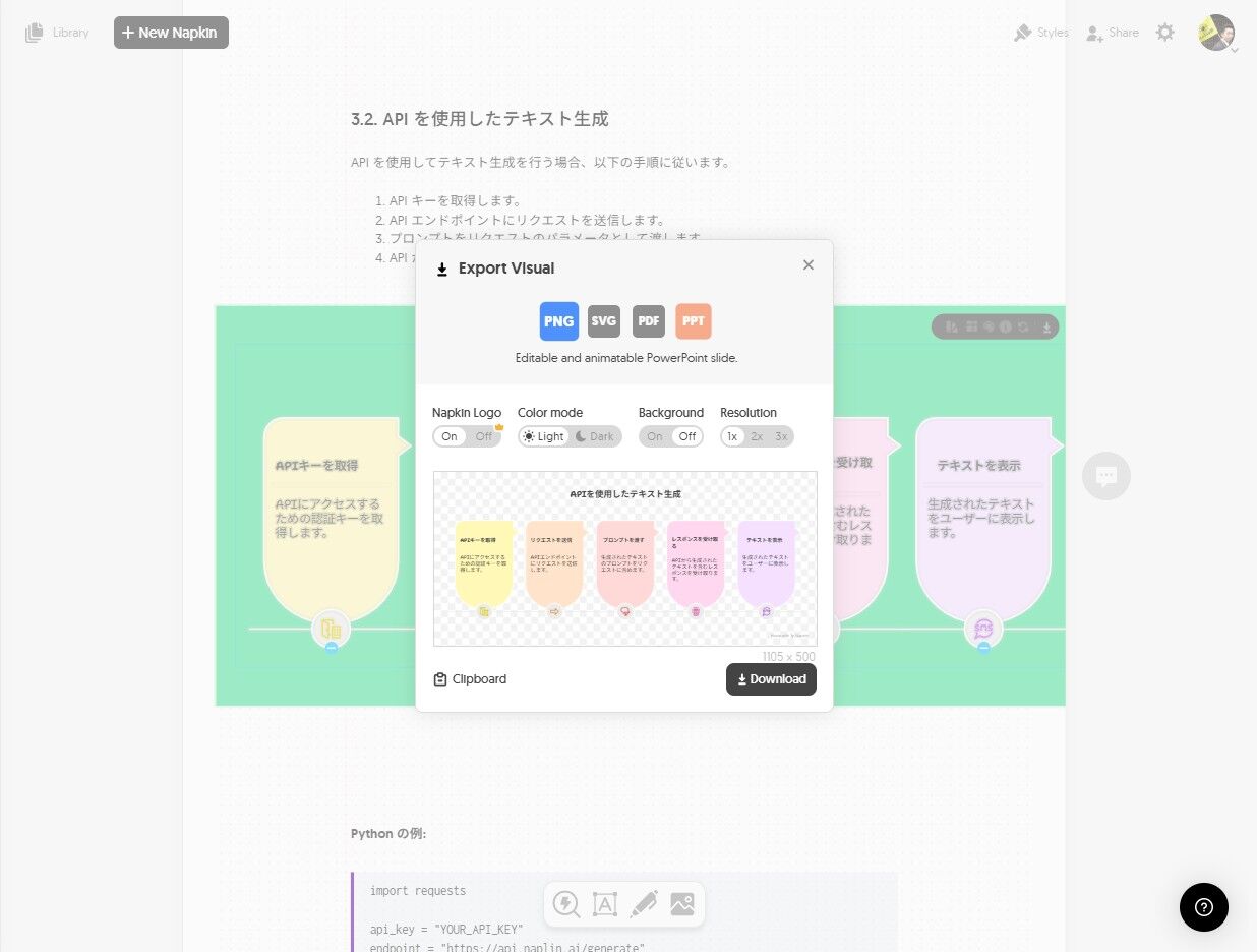 下のように、出力形式が、PNG,SVG,PDF,PPTと選べます。