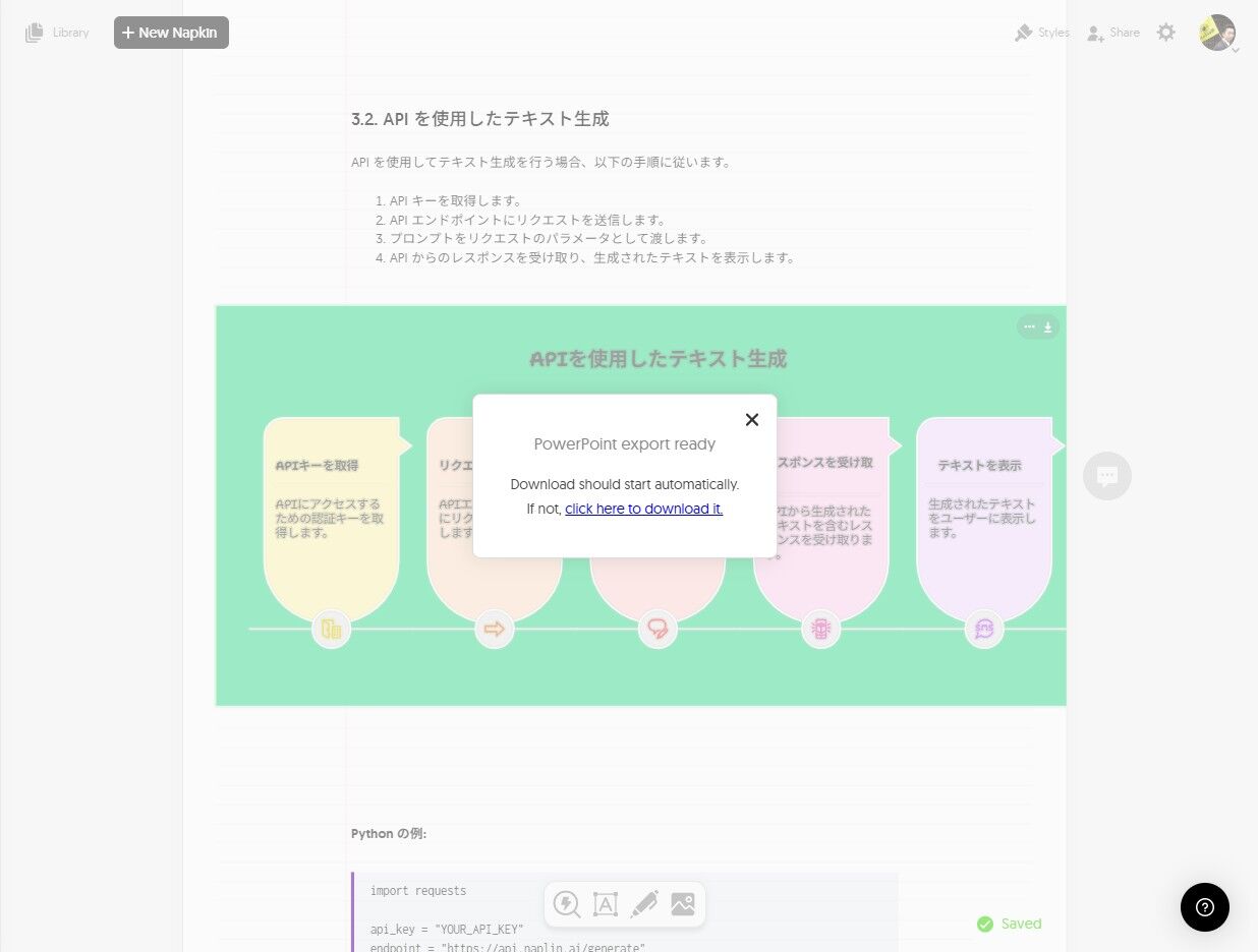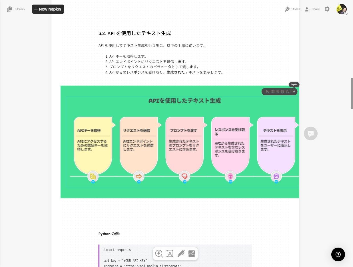 上の画面で”NaplinAIの使い方”と打ち込み「continue」をクリックすると、